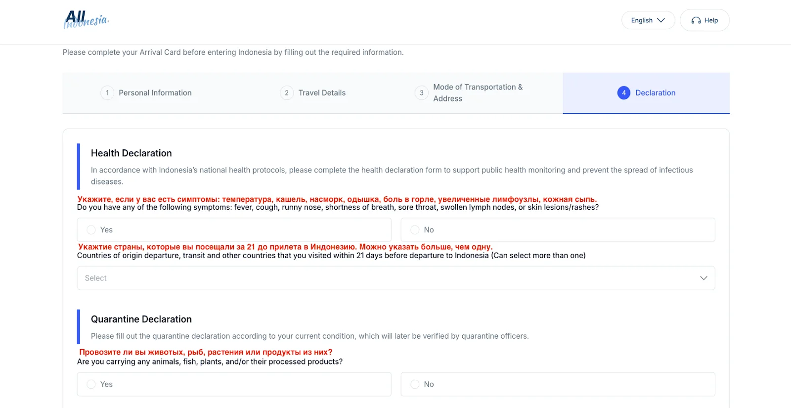 ● Заполненная онлайн-декларация через приложение All Indonesia*
