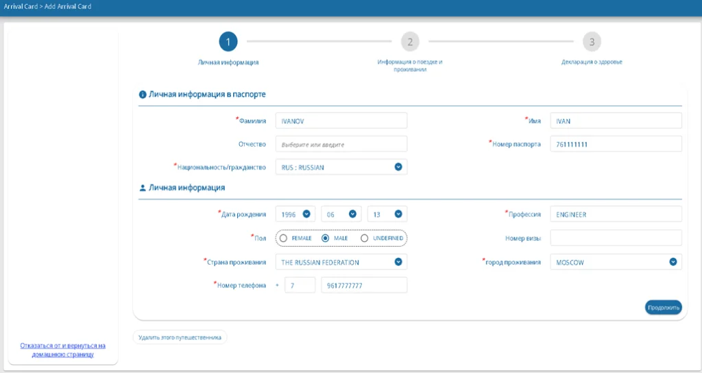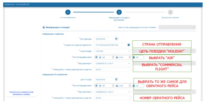 Шаг 2 – Кликнуть «Карта прибытия» для заполнения анкеты