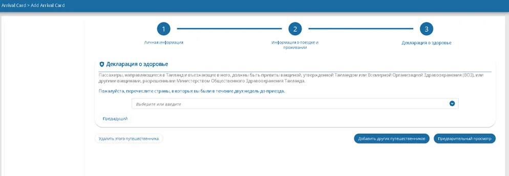 Шаг 6 – Ознакомиться с декларацией о здоровье. Кликнуть «Предварительный просмотр» для продолжения. Для заполнения анкеты других участников кликнуть «Добавить других путешественников»